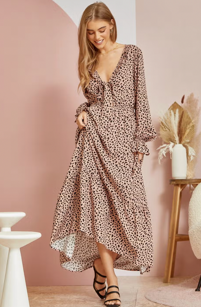 This stylish printed dress with v a v-neckline and the tie front detail on the front and is open below the tie. Long sleeves ruffle on the neckline with midi length. Nonsheer, woven.