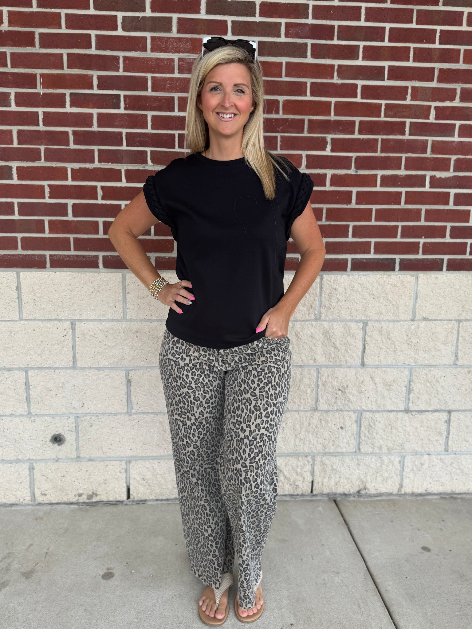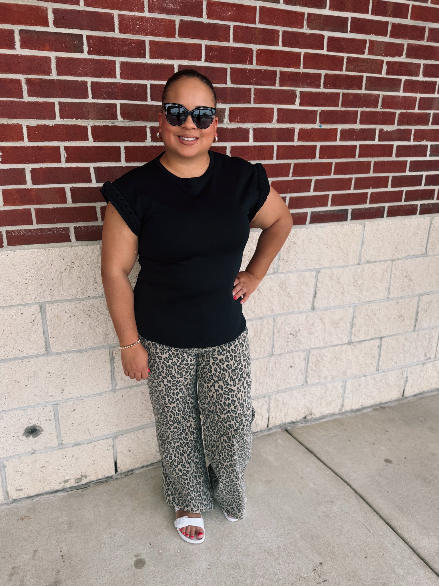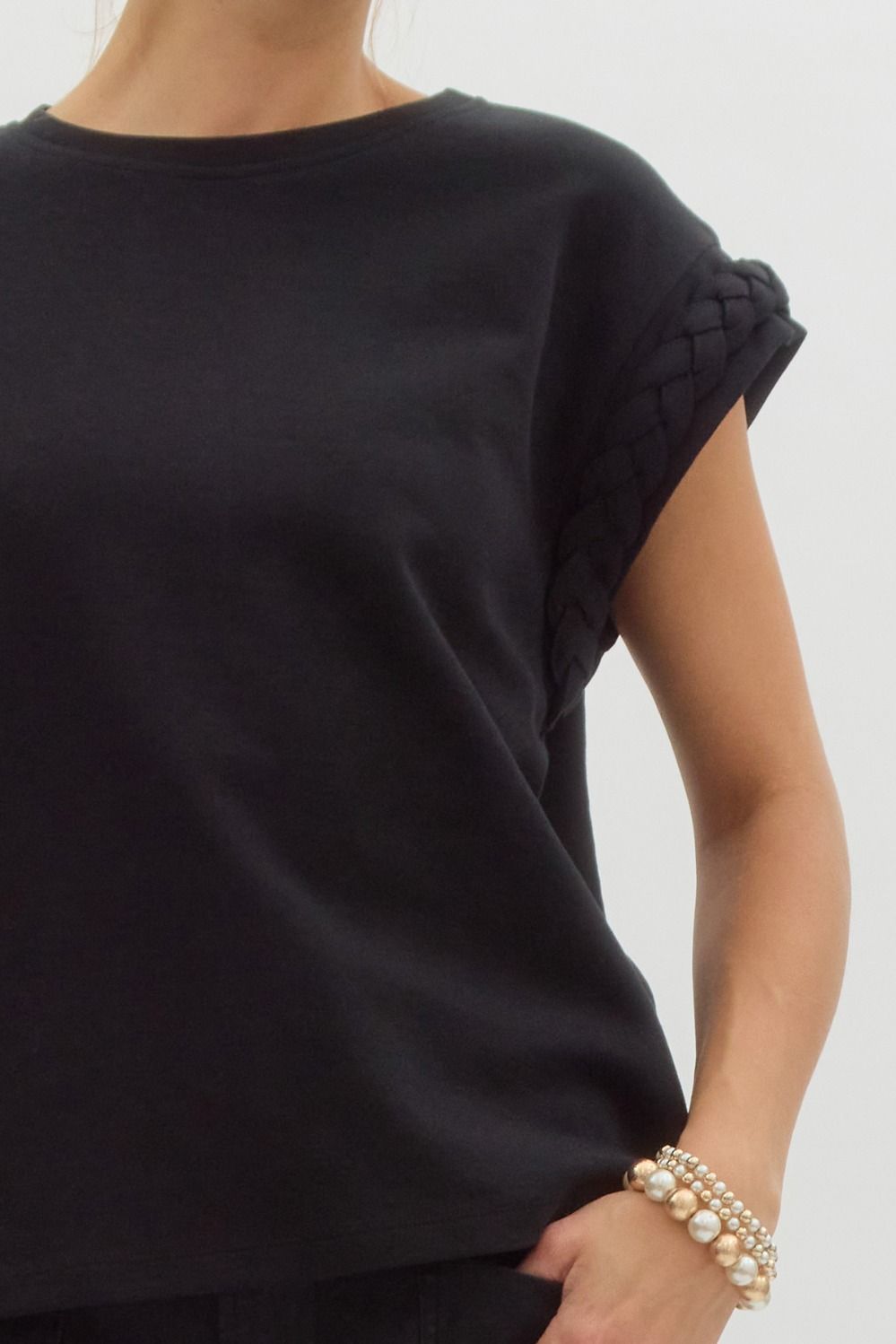 Solid round neck cap sleeve top featuring braided detail at cuff. Unlined. Knit. Non-sheer. Lightweight.