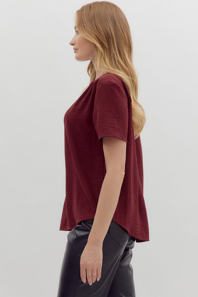 Classic split V-neck short sleeve pullover top. Unlined. Woven. Non-sheer. Lightweight.