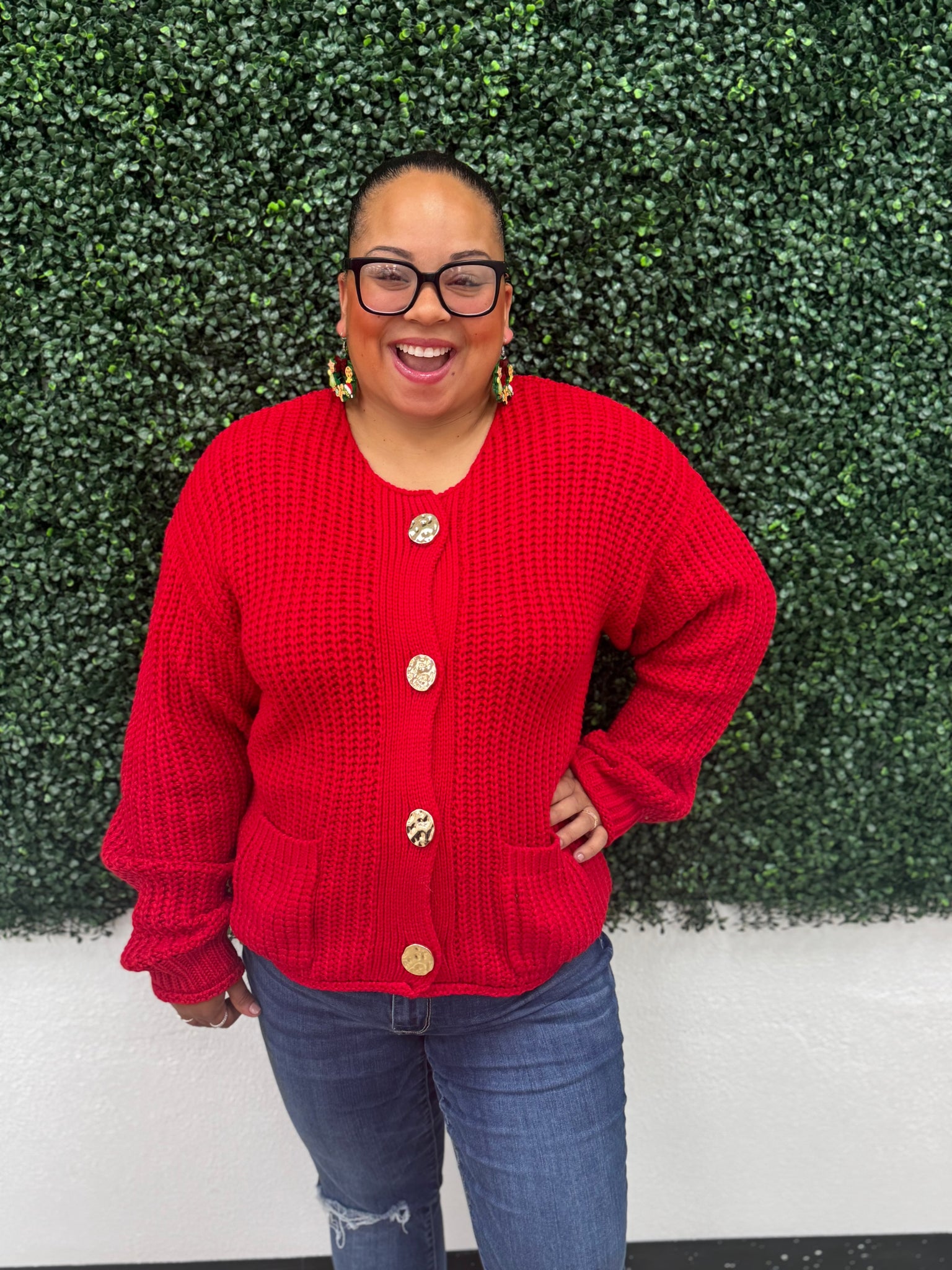 Drop shoulder button down sweater cardigan with pockets, big button accent.