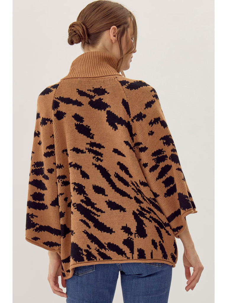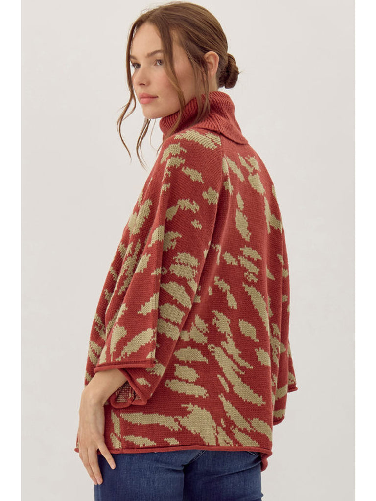 Print knit pullover sweater top with a turtle neckline, 3/4 raglan dolman sleeves, and natural cut hems. Non-sheer, lightweight. 100% acrylic.