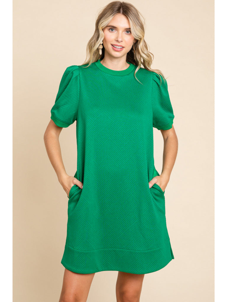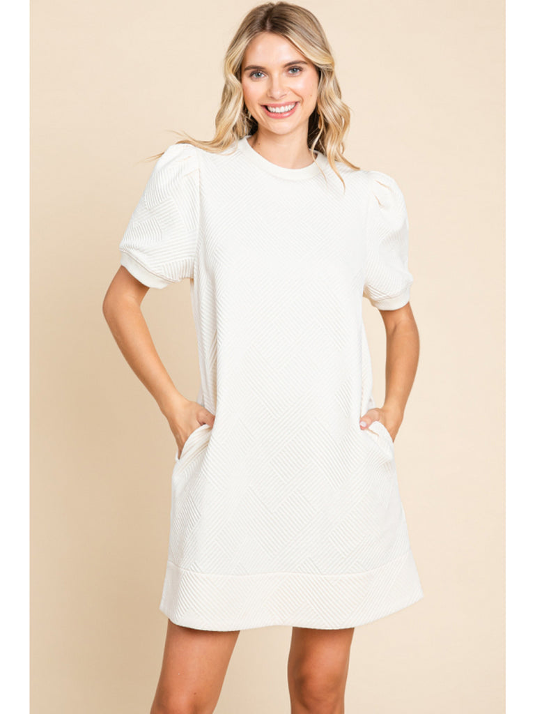 Textured dress with a U-neck, side pockets, short tucked sleeves, band cuffs, and vented hemline.