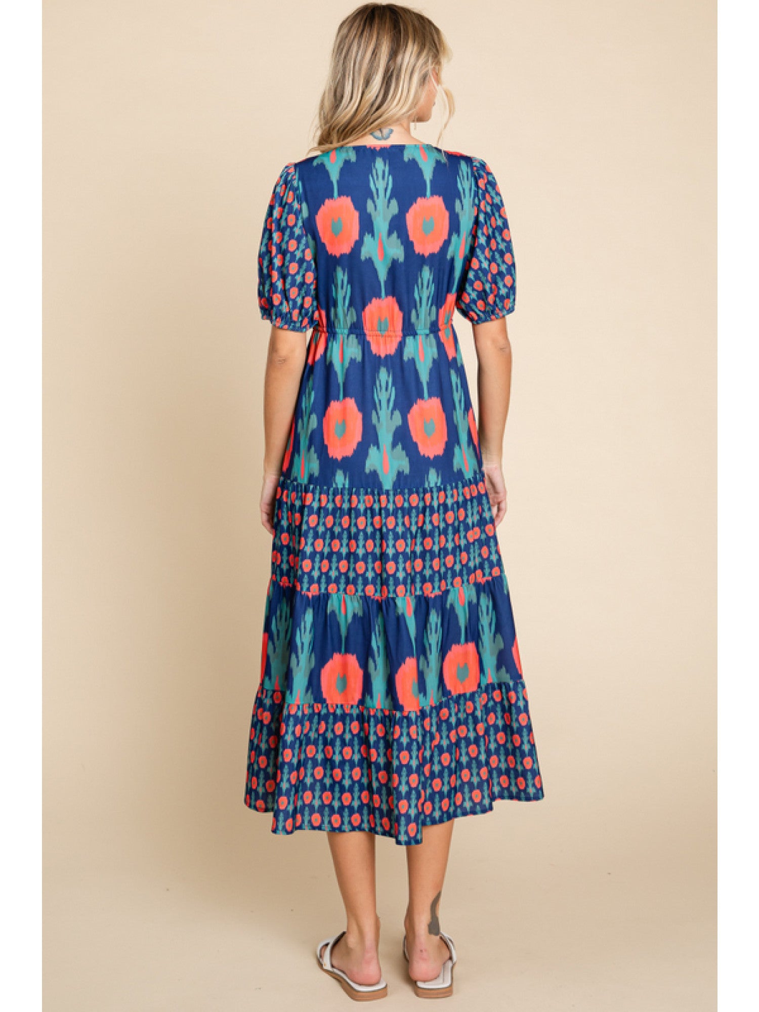 Print midi dress with a V-neck, drawstring waistline, side pockets, short bubble sleeves, and tiered layer.