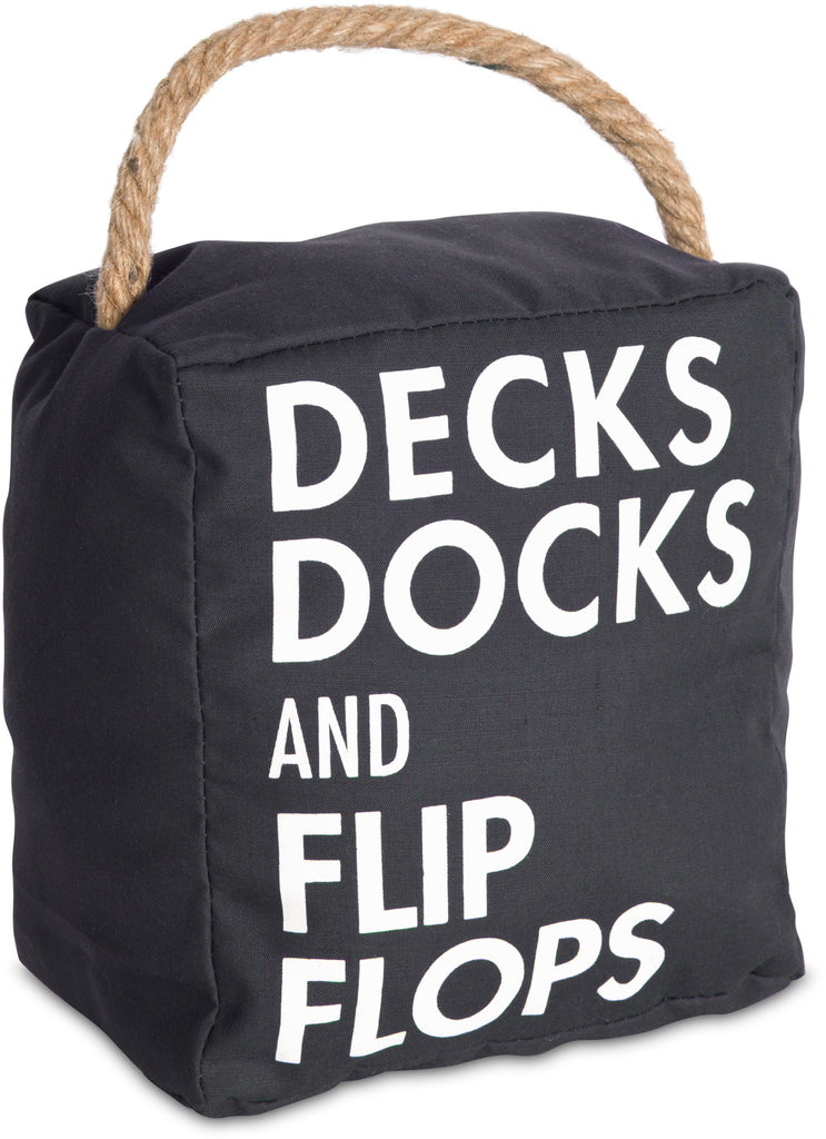 This decorative 5" door stopper is packaged in a plain box. It is made from polyester, linen, and rope and filled with sand and polyester. Best if used for interior doors, not for heavy fire doors, and weighs approximately 2 pounds.