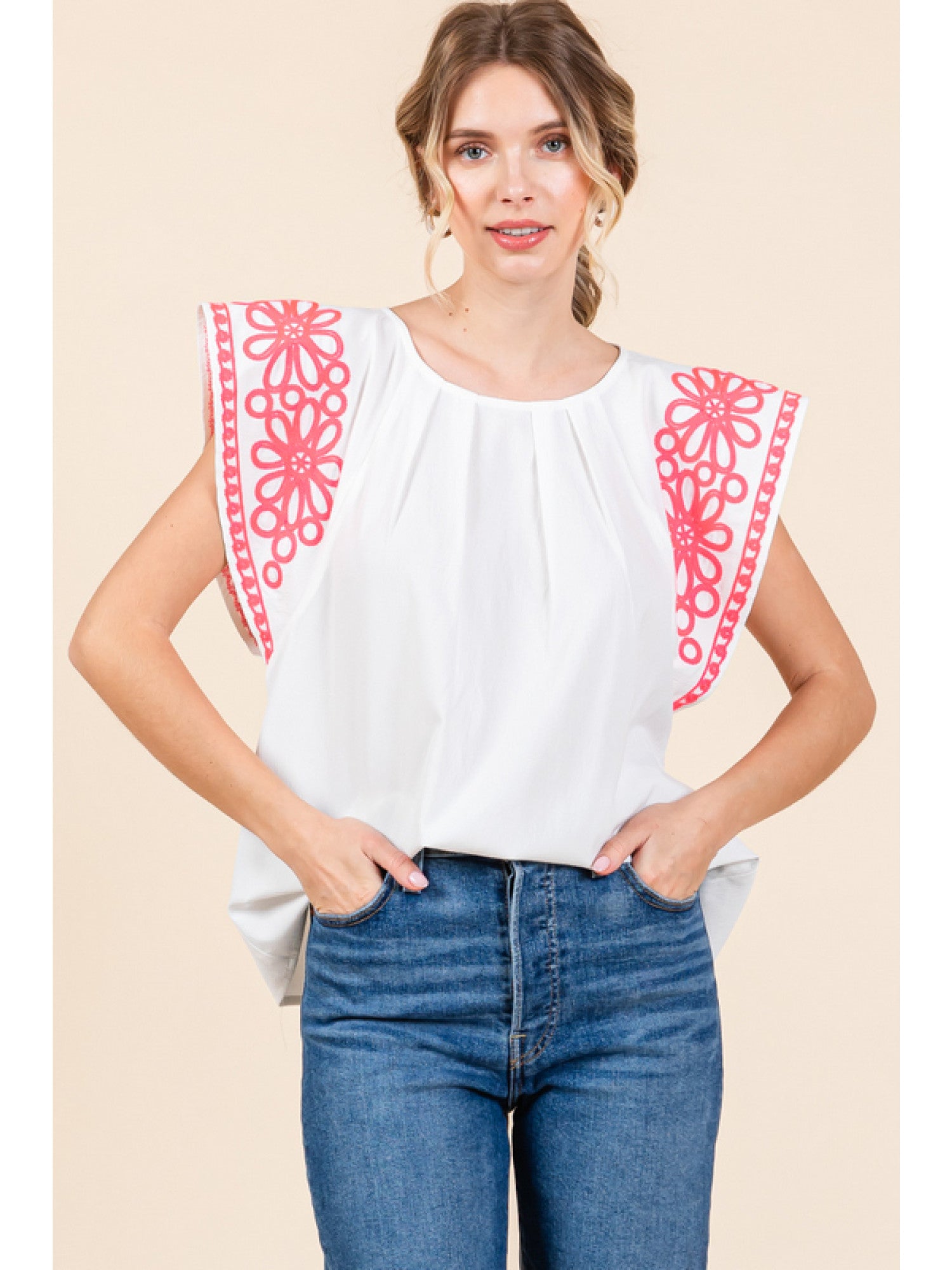 Solid top with U-neck featuring tucked detail, back buttoned closure, flutter sleeves and embroidery.