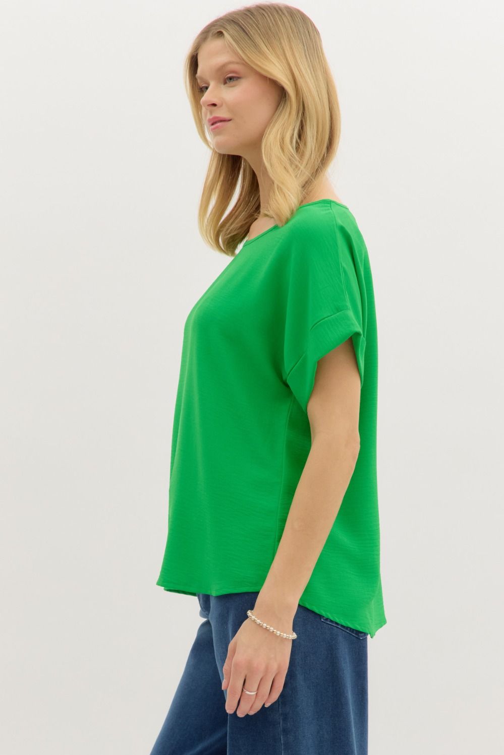 Classic round neck short roll-up sleeve pullover top. Unlined. Woven. Non-sheer. Lightweight.