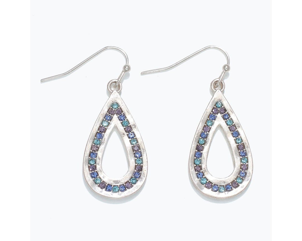 Hammered silver drops with blue and lilac crystals