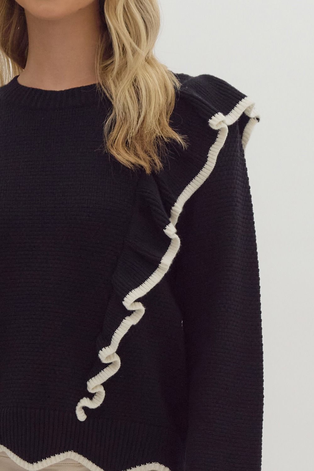 Solid long sleeve knit sweater featuring ruffled detail. Contrast hem. Unlined. Knit. Non-sheer. Lightweight.