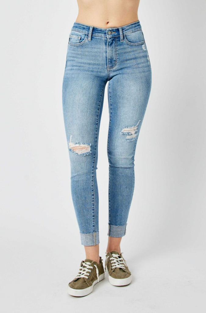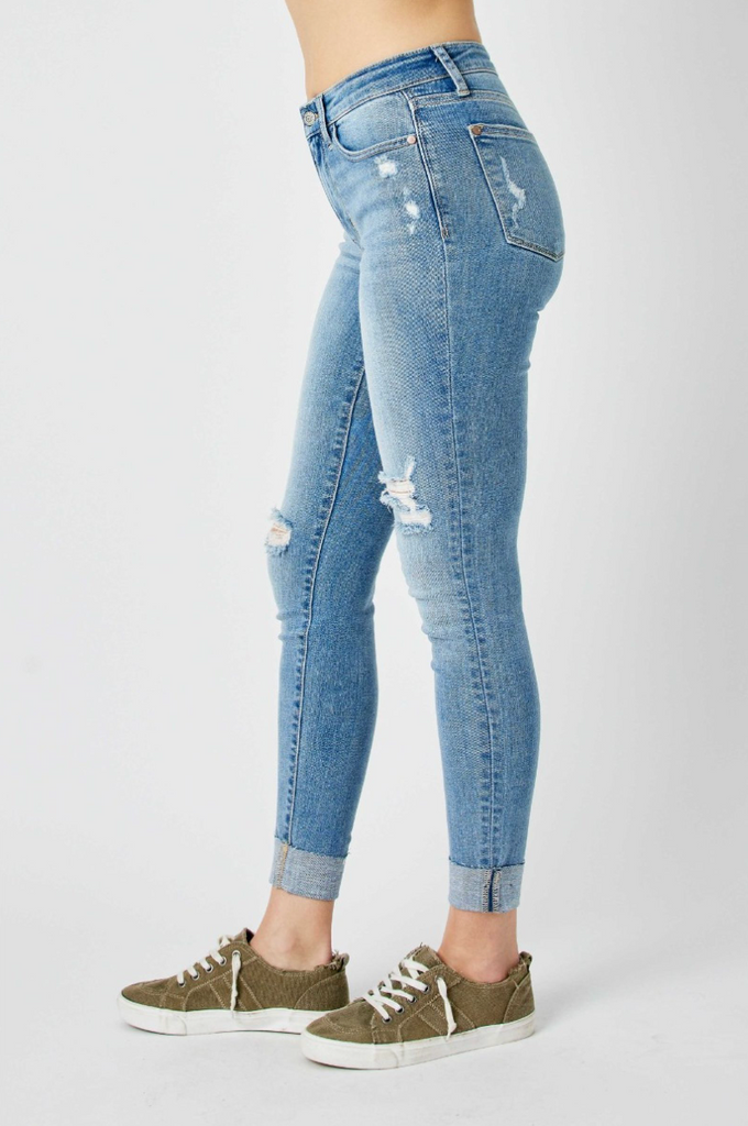 Judy Blue Mid Rise Destroyed Cuffed Skinny Jeans