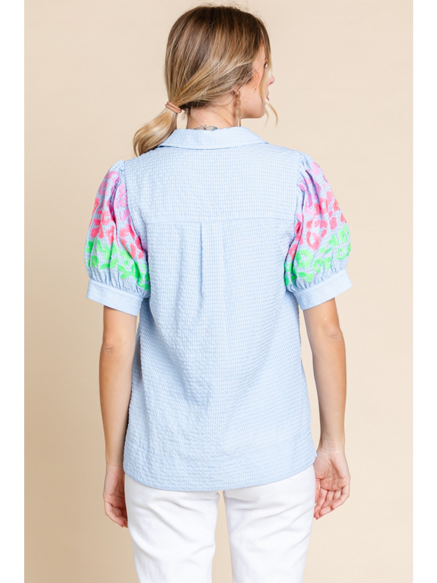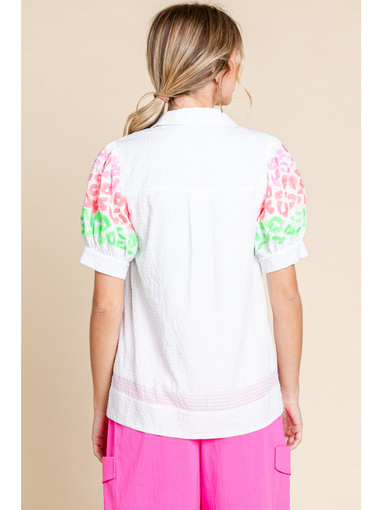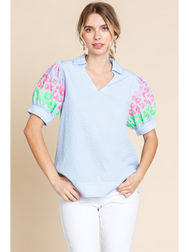 Textured top with open collared neck, back box pleated, short peasant sleeves featuring leopard print, band cuffs, and vented hemline.