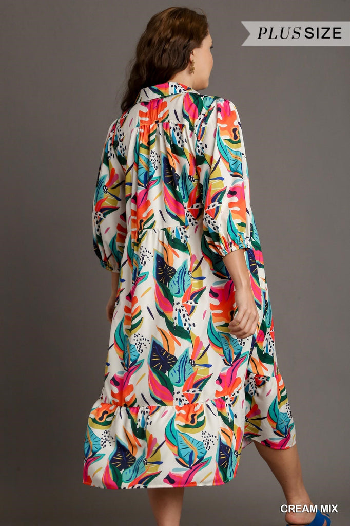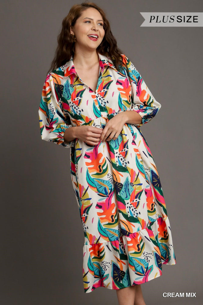 Tropical print A-line collared V-neck midi dress with 3/4 sleeves