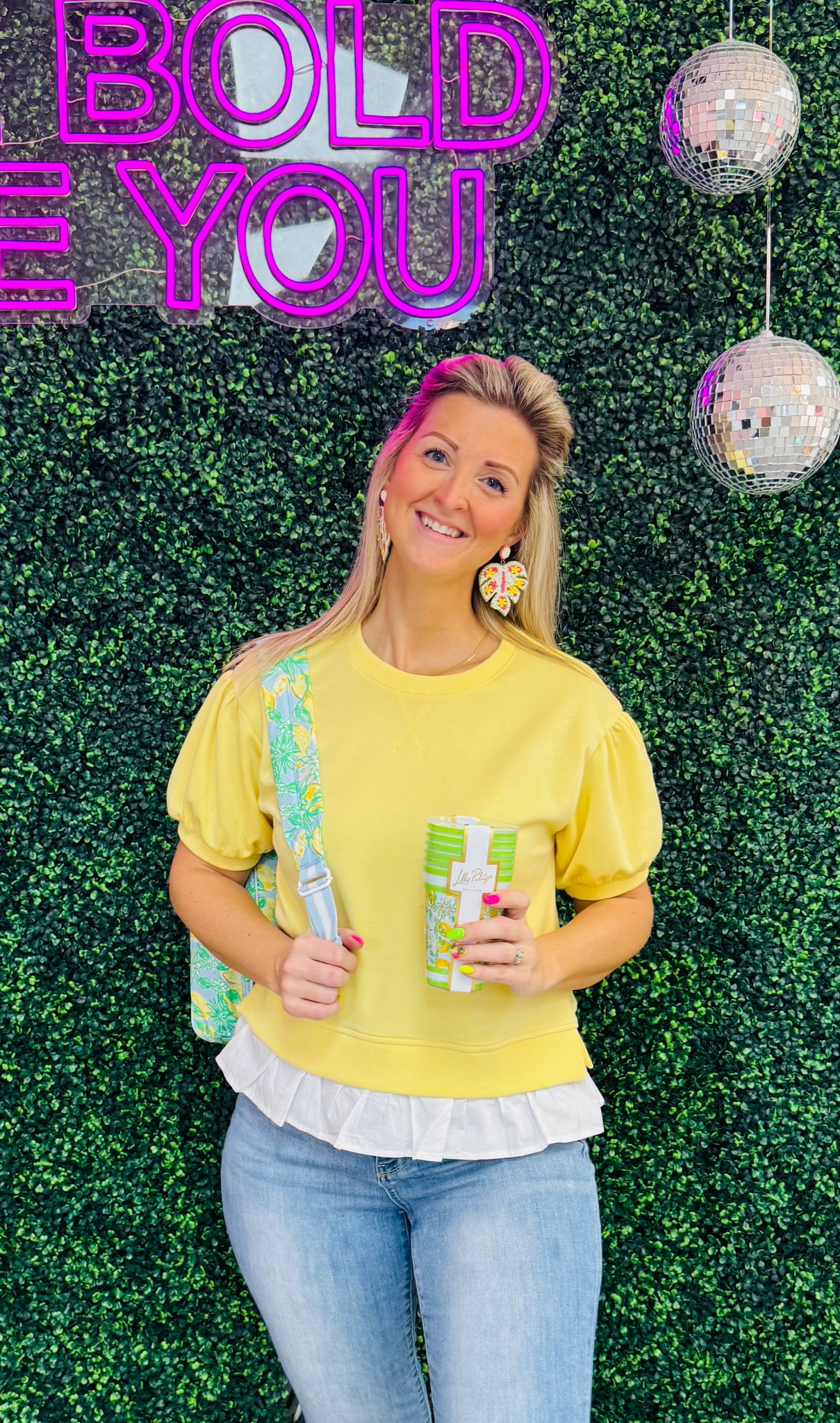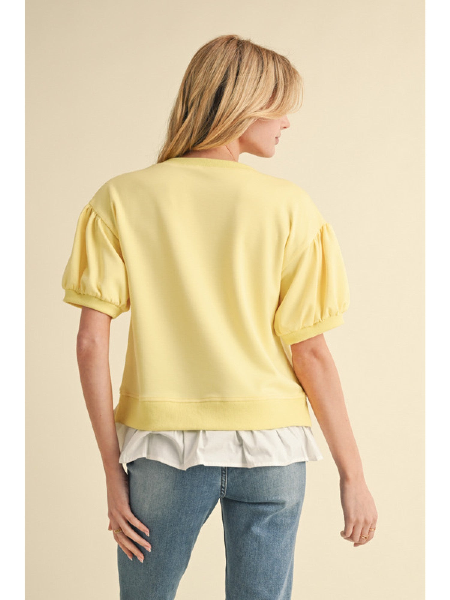 Solid sweatshirt top with U-neck, short sleeves with gathered detail for a balloon effect, and solid ruffly trim at the hemline.
