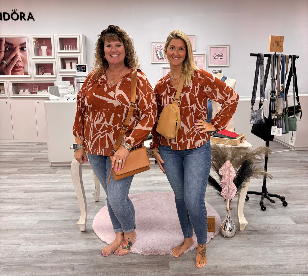 Long sleeve, v-neck top with a ruffle detail and abstract print