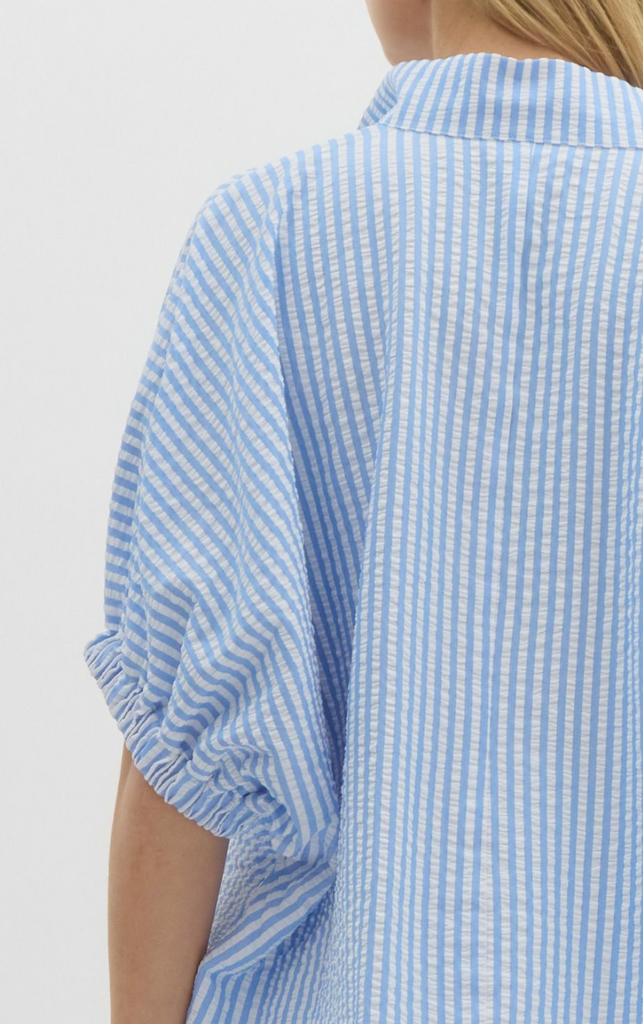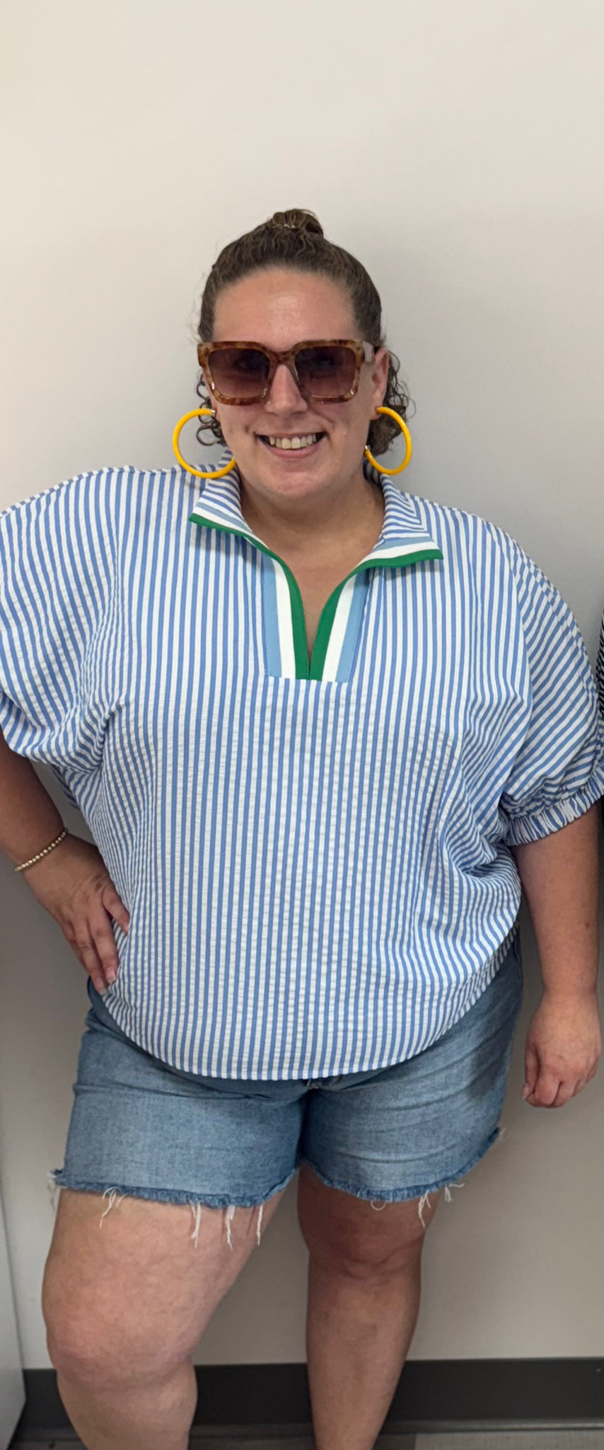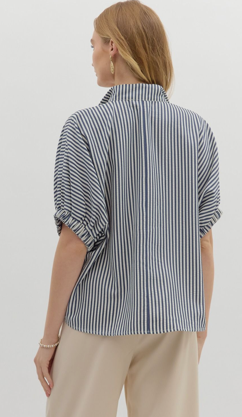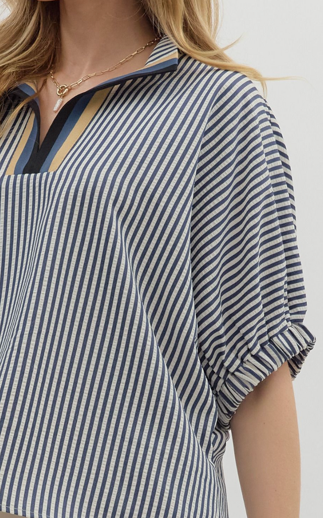Stripe pattern high neck elasticated sleeve band dolman top featuring accented multicolor rib band split neck. Unlined. Woven. Non-sheer. Lightweight.