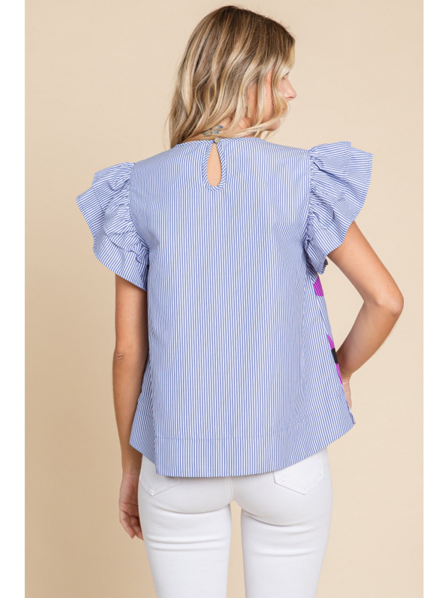 Striped flower print top with a U-neck, back buttoned closure, layer ruffled shoulder, and band hemline.