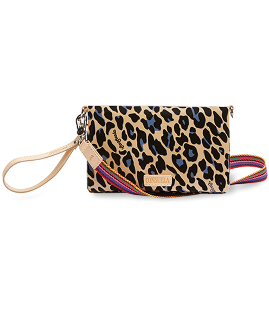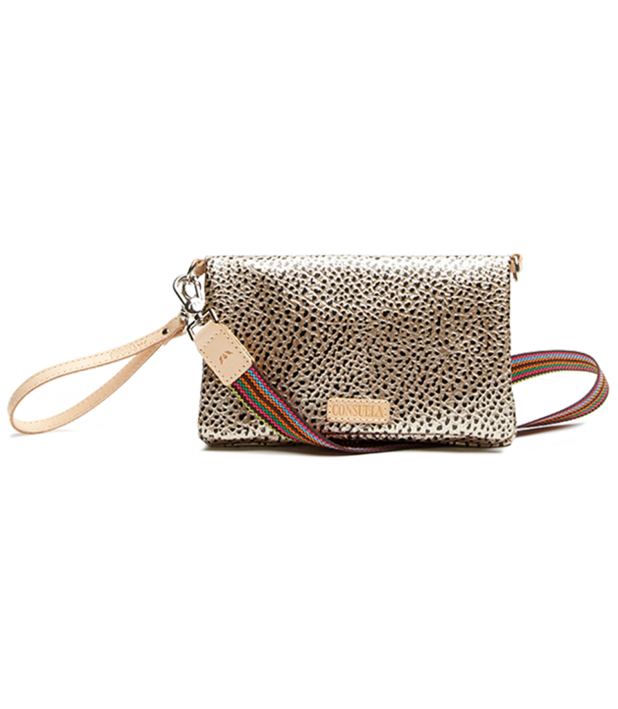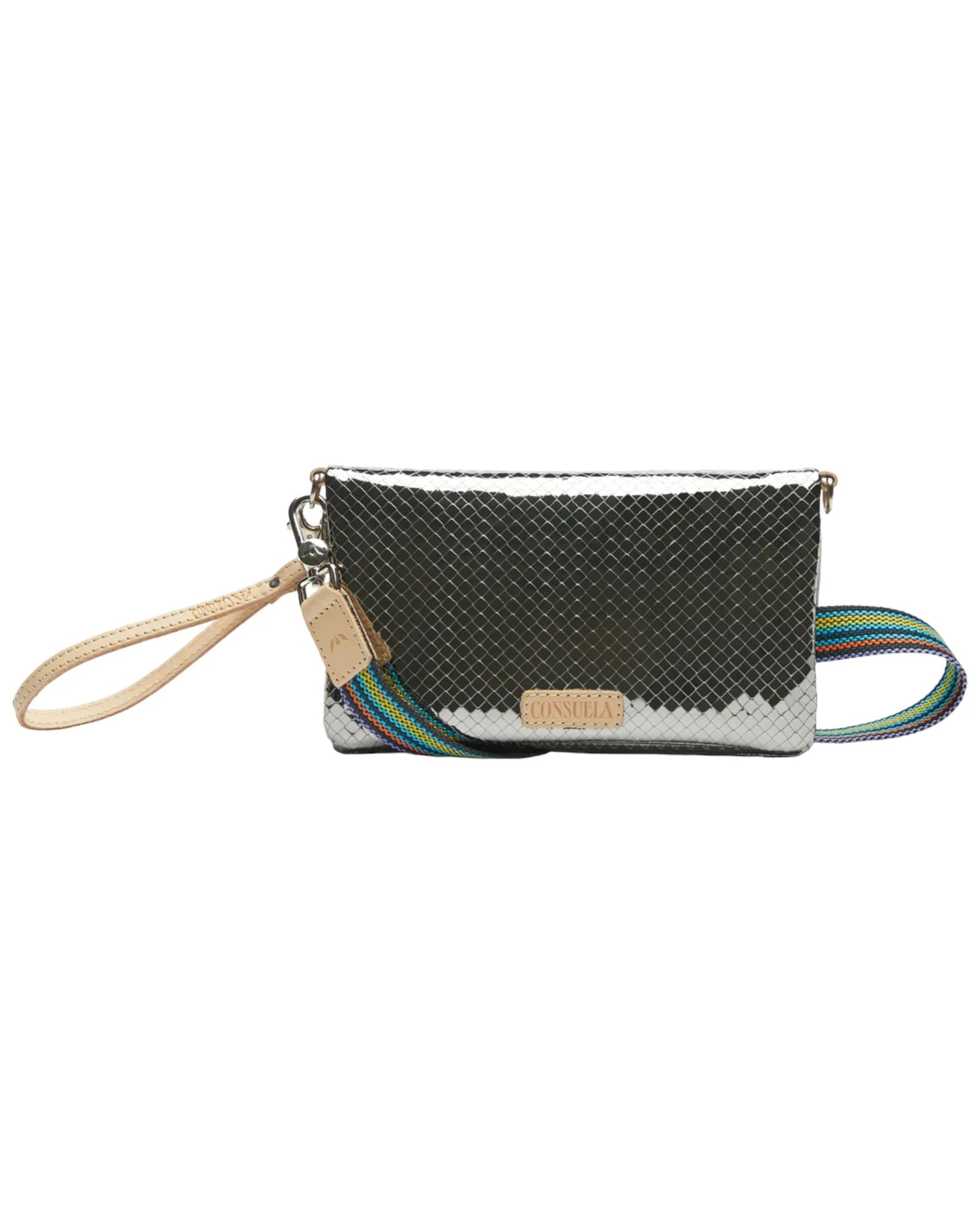 - Included detachable wristlet strap and adjustable woven crossbody strap