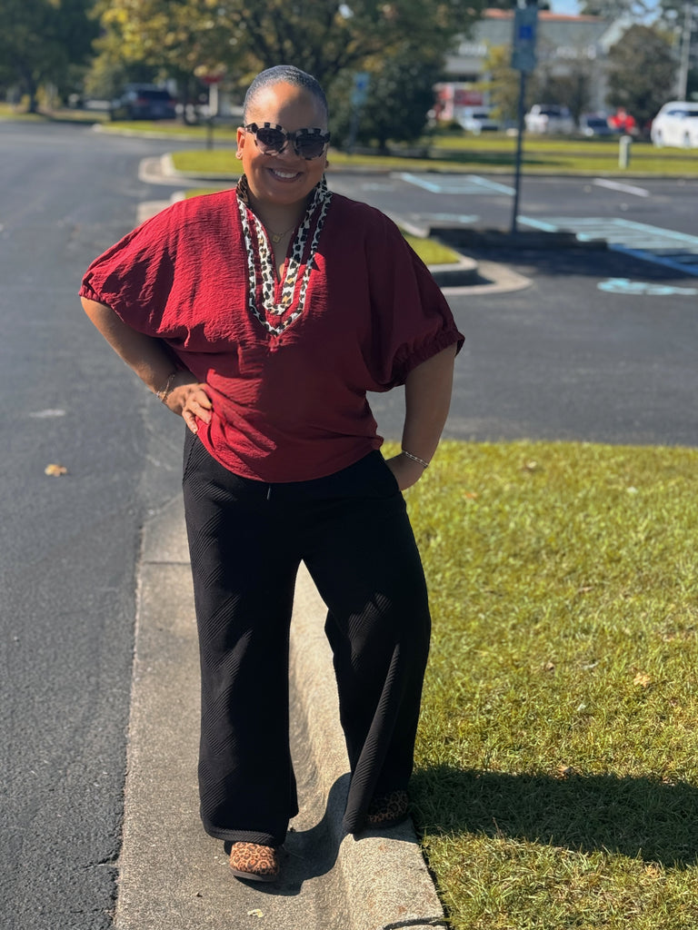 Solid elasticated sleeve band dolman top featuring leopard print accented caftan-inspired split neck placket. Unlined. Woven. Non-sheer. Lightweight.